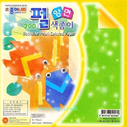 Size: 15cm by 15cm Number of sheets: 5 sheets No. of colours/patterns: 10 colours Colour side: Colour on one side and a different colour on the other side. Thickness of paper: Same thickness as normal Origami paper. Description These sheets have pearlescent (shiny) solid colours on each side. The pack contains: - 1 sheet with peach on one side and brown on the other - 1 sheet with light green on one side and dark green on the other - 1 sheet with light blue on one side and dark blue on the other - 1 sheet with orange on one side and green on the other - 1 sheet with red on one side and yellow on the other Postage and packaging (P&P): The total postage and packaging cost is made up of: The postage cost per item + A single cost for packaging The per item cost is: Delivery address in UK - £0.20 per item Delivery address in Europe (Excluding UK) - £0.40 per item Delivery address rest of the world (Excluding Europe) - £0.60 per item.